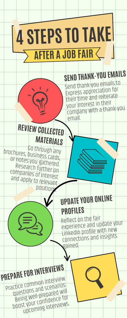 When attending a job fair, the possible opportunities don’t end when the job fair does. Here are four steps to follow to secure those job prospects that caught your eye.